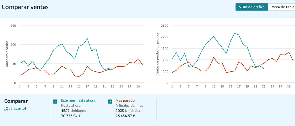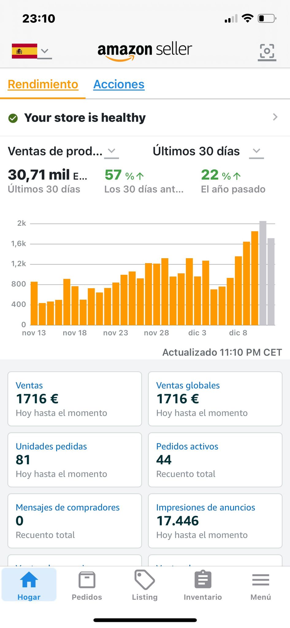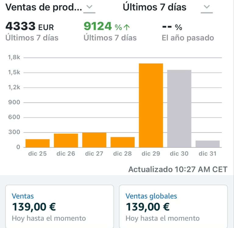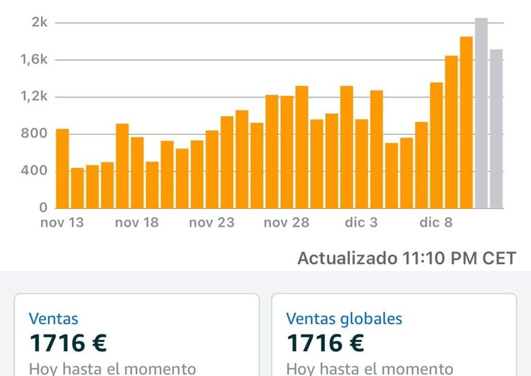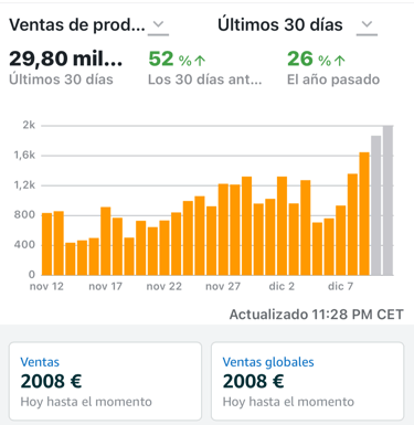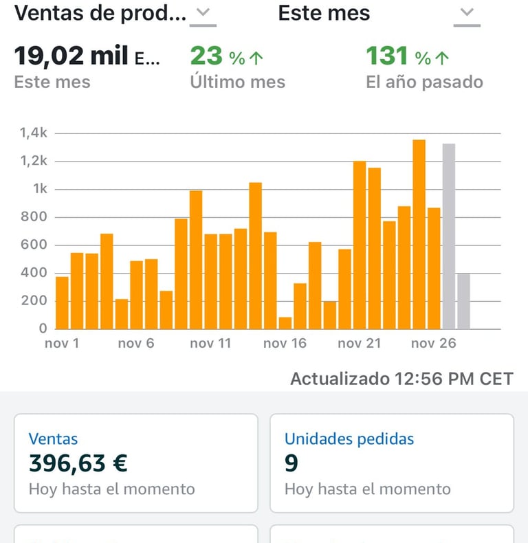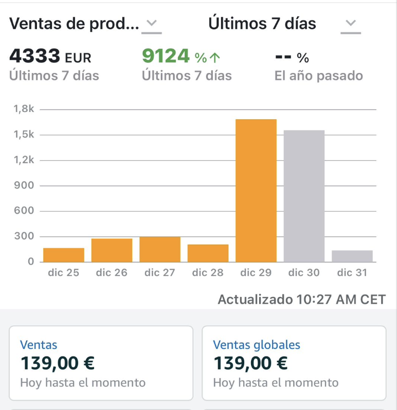 El mes pasado, este cliente alcanzó una facturación total de 23.456,57 €. Sin embargo, desde que comenzamos a trabajar juntos el 1 de diciembre, ya hemos logrado facturar 30.736,94 € en solo 23 días, superando ampliamente los resultados del mes anterior. Y lo mejor: ¡todavía quedan 8 días para cerrar el mes! Todo esto ha sido posible gracias a nuestra optimización de SEO en títulos y bullet points, mejoras en imágenes y contenido A+, y la implementación de estrategias publicitarias efectivas.