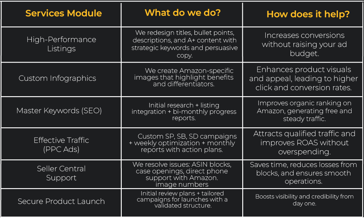 La Aceleradora de Tiendas Amazon es un servicio 100% personalizado donde nos encargamos de todo el crecimiento de tu tienda. Desde el SEO hasta la atención al vendedor, campañas publicitarias, búsqueda de productos ganadores, contenidos, y más.
